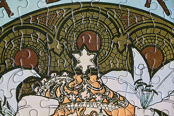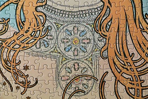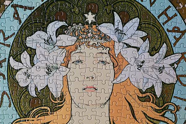 慕夏將女人的清柔、嫵媚又迷人的神情,都在他細緻筆觸下完美呈現,以高雅清新的百合花結合頭飾與寶石紋飾,與現今流行的波西米亞風相似,吸引了當時貴婦名媛的喜愛而爭相麼訪。(此段文字為雷諾瓦介紹)